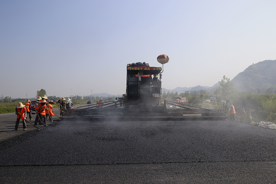 2019年8月,宜春經(jīng)開區(qū)S311路面攤鋪現(xiàn)場(chǎng),工友們輔助路面兩側(cè)的分料、補(bǔ)窩等作業(yè)